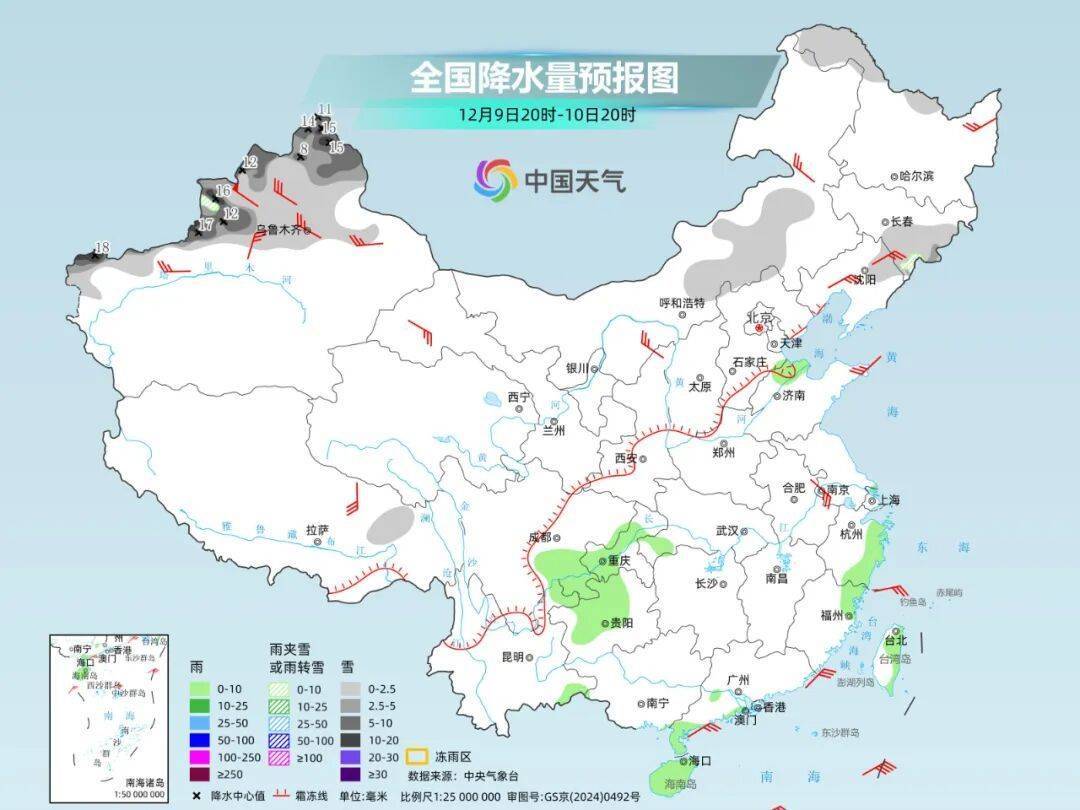 中央气象台预计,10日至13日,新疆西部和中北部、西北地区东部、华北、黄淮中北部、东北地区东部等地有中到大雪或雨夹雪,其中,山西中南部、河北南部、河南中北部等地的部分地区有暴雪(主要出现在11日至12日),新增积雪深度5至8厘米,局地10至15厘米;黄淮南部及以南地区有小到中雨,局地大雨。