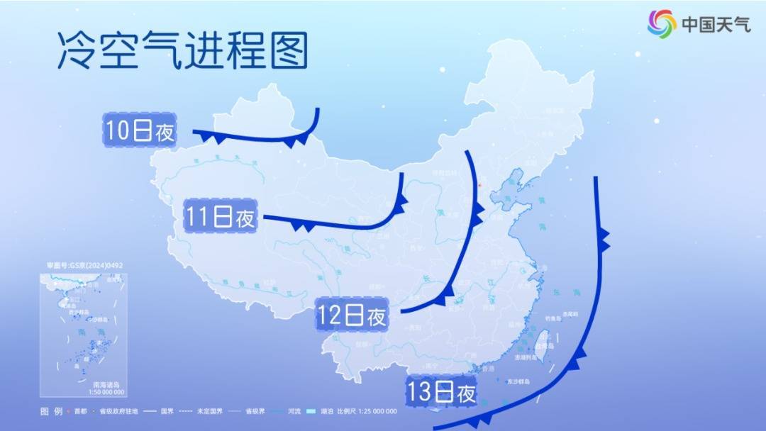 从降温进程来看,10日主要影响新疆,11日影响西北和华西地区,12日影响中东部地区,13日影响东北及南方地区。此次寒潮过程最低气温0℃线将抵达江南北部,较上一轮寒潮过程偏南。