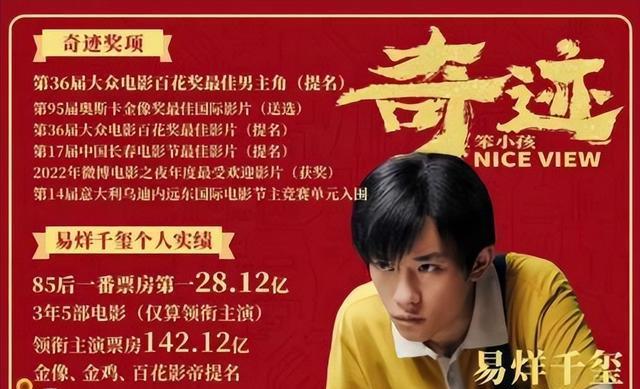 2022年金鸡奖,易烊千玺饰演的《奇迹·笨小孩》的创业者景浩让他第三次提名,13.77亿票房让易烊千玺彻底摆脱“流量”标签。